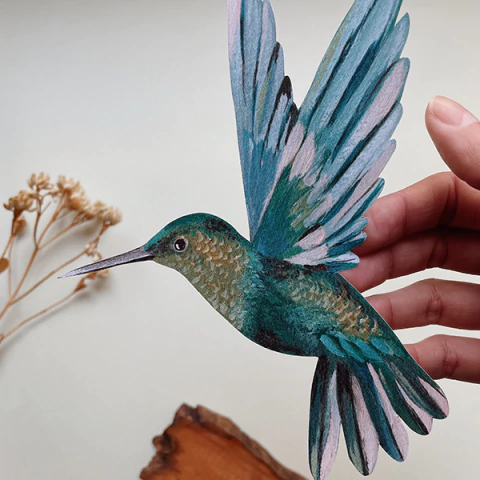 A fauna e flora brasileira é rica e exuberante. Traz beleza, mas mais do que isso, traz equilíbrio e cura. Isso transborda para meu trabalho tanto em imagem, como também em textura, e pode ser observada na madeira, a qual utilizo como suporte de pintura.